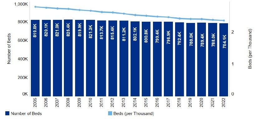 Chart 2.2: Number of Beds and Number of Beds per 1,000 Persons in Community Hospitals, 1995-2022